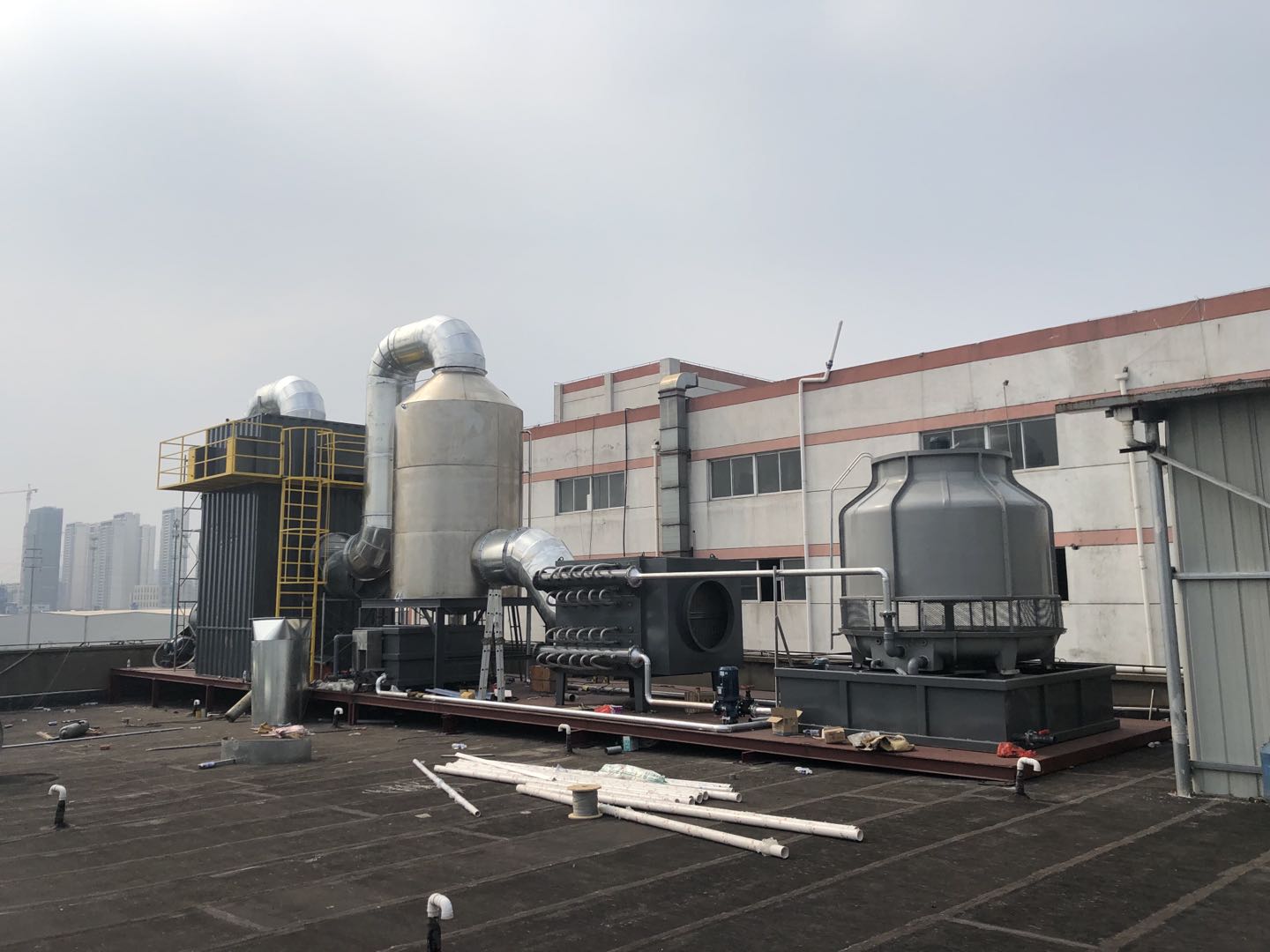 (2)工藝說(shuō)明 紡織定型拉幅工序產(chǎn)生的氣體和煙霧,由集氣裝置對(duì)其進(jìn)行收集后輸送到冷凝器——>噴淋塔——> 濕電等離子設(shè)備——>風(fēng)機(jī),進(jìn)行凈化處理后經(jīng)排氣筒高空排放。