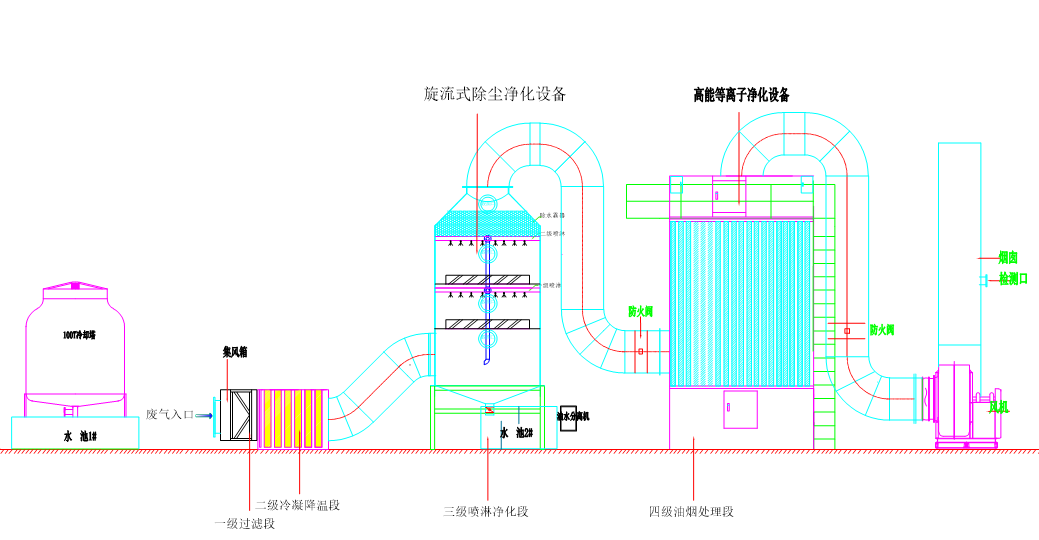 (1)工藝流程 紡織印染定型機(jī)油煙廢氣——>風(fēng)管收集——>冷凝器——>噴淋塔——> 濕電等離子設(shè)備——>風(fēng)機(jī)—>達(dá)標(biāo)高空排放