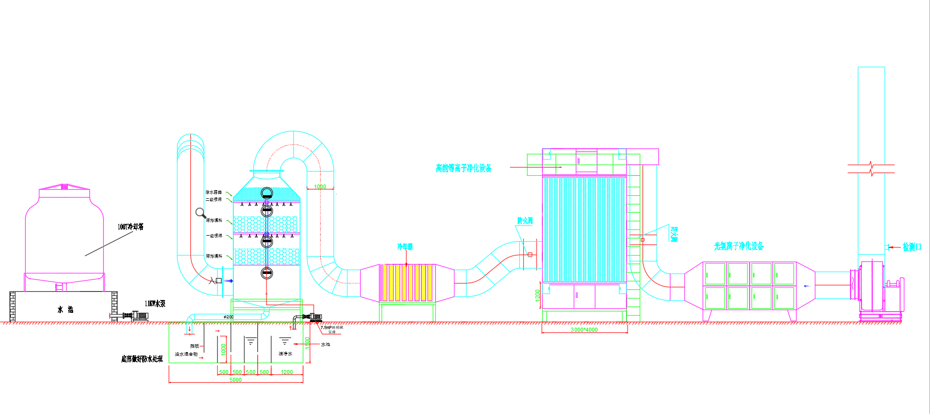 斜底爐油煙廢氣——>風(fēng)管收集——>旋流噴淋塔——>冷凝器——> 濕電等離子設(shè)備——>光氧離子—>風(fēng)機(jī)—>達(dá)標(biāo)高空排放