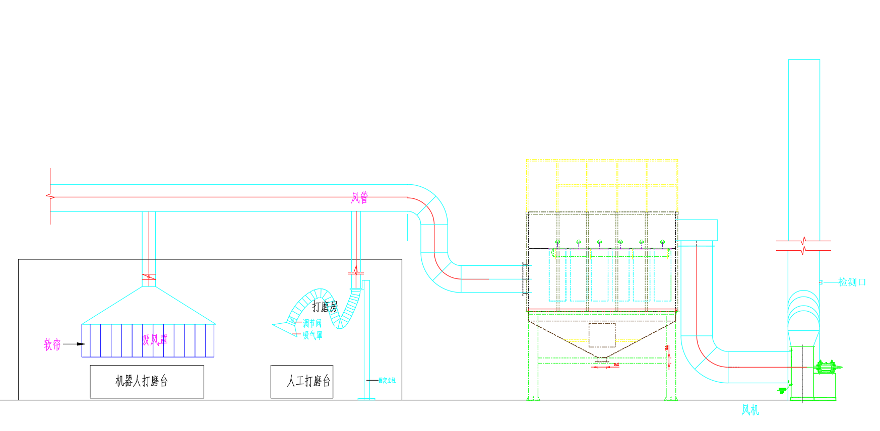 焊接廢氣——>風(fēng)管收集——>濾筒除塵設(shè)備——>風(fēng)機(jī)—>達(dá)標(biāo)高空排放