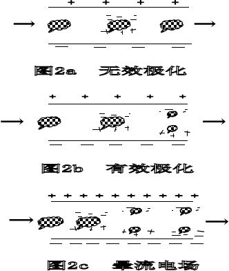 達到了極化的目的。圖2c是已形成暈流的電場(電壓值超過了起暈電壓),其負極發(fā)射出的電子流擊中并附著在油粒子上,形成連 “扯”帶“粘”的狀況,使油粒子被充分極化和荷電。因此,只有起暈后的電場其極化和荷電效果是最好的。