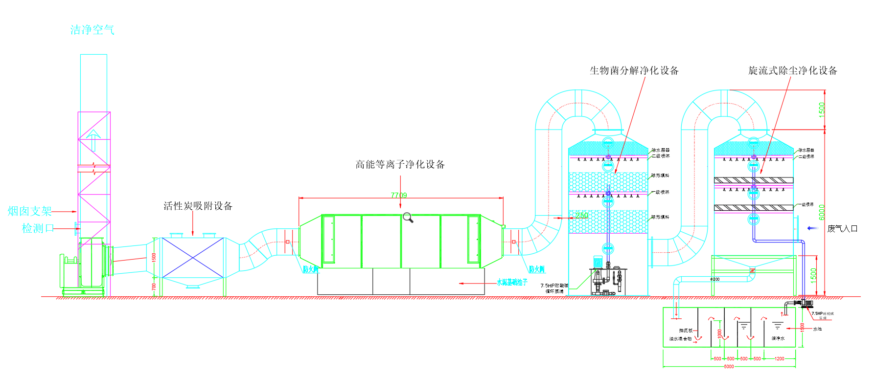 塑料造粒廢氣——>吸風(fēng)罩——>風(fēng)管收集——>旋流噴淋塔——>生物噴淋塔——> 濕電等離子設(shè)備——>活系統(tǒng)吸附—>風(fēng)機(jī)—>達(dá)標(biāo)高空排放